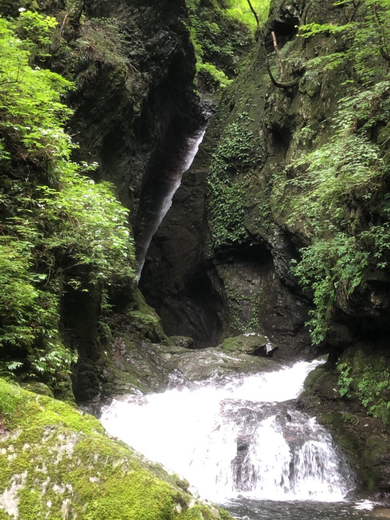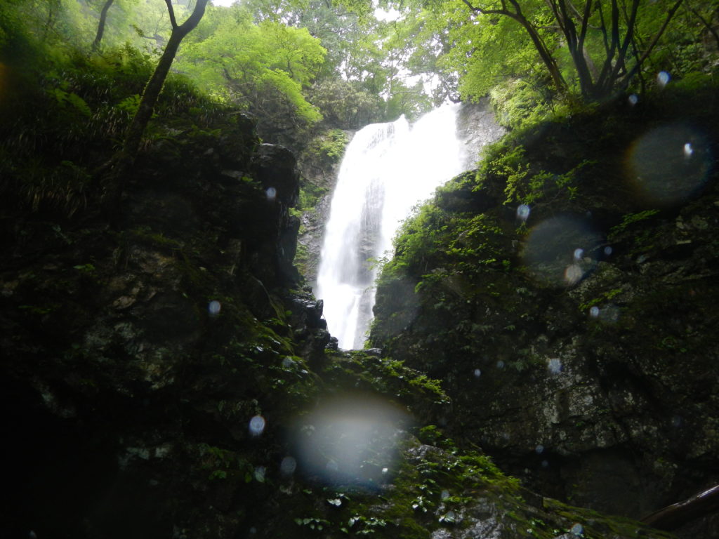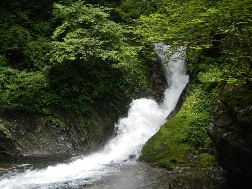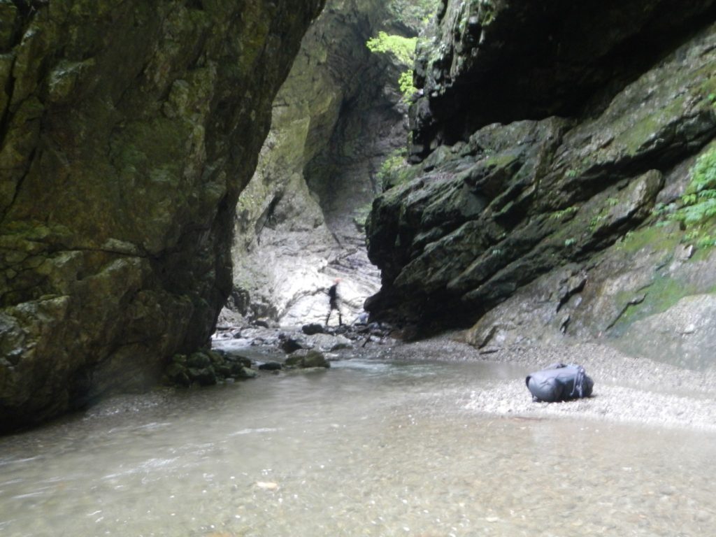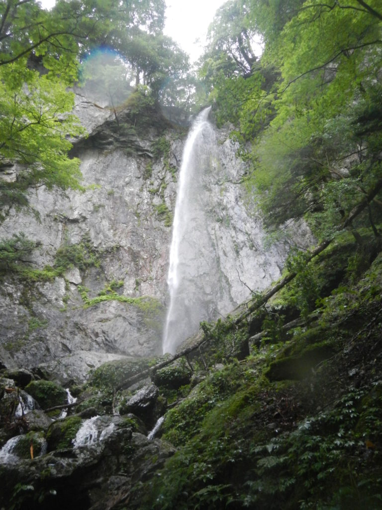 先ほどの神戸パーティと前後しつつ進む。前日までの雨でかなり増水した水量で神戸パーティは普段ならなんでもないところでもロープをだして安全を期している。2人ほど激流の浅瀬に飲み込まれていたが浅瀬なので問題はない。われわれも同じようにロープを出して進む。双竜の滝、洞門の滝等が美しい。