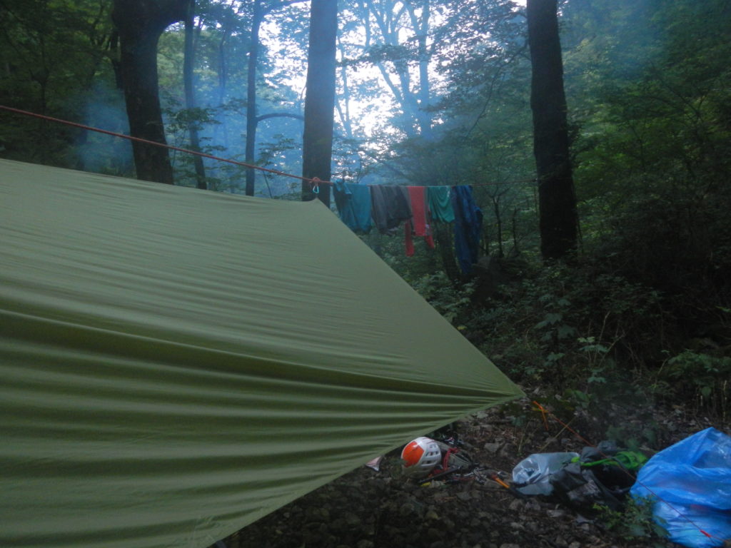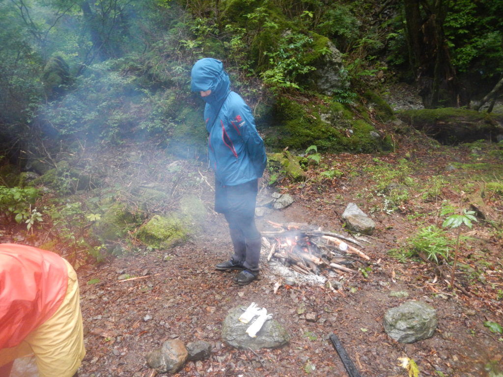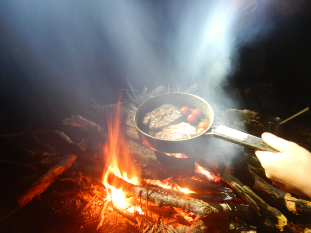 快適そうな場所で水汲み場や焚き火跡のような雰囲気もある。さっそく幕営地をここに決め、木とロープを使ってタープを張り、薪集め、夕食の準備をする。連日の雨で薪となる木はすべてぐしょぬれ。しかしそこは腕の見せ所!?乾いた枝をあつめて最初の火がついた。そうしたらこっちのもの、燃え方が悪かったが最終的には豪快な焚き火に成長。持ってきた鹿肉内ロースを焼いてパワーを補給する