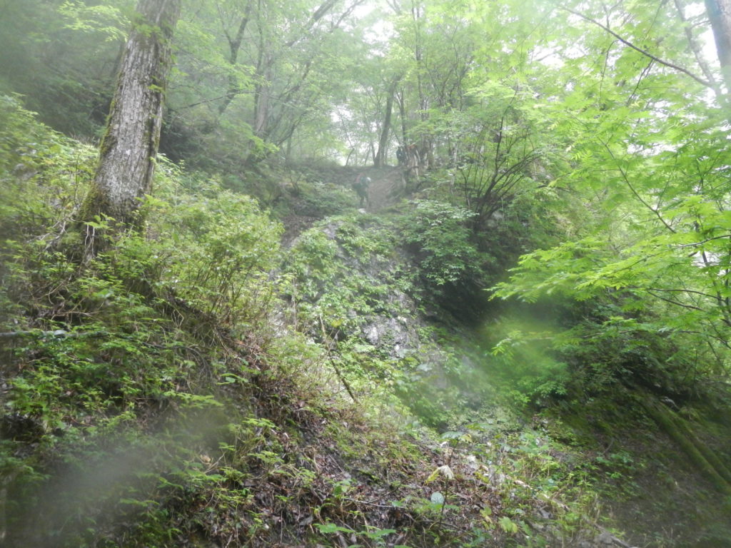 幸次郎窟を後にして高巻きを開始する。出だしにピンクのテープがあり、道はわかりやすい部類だがトラバースがちょい悪で、これまでの雨でぬかるんでいるのもあり、慎重に進み、ロープいるかな?いや、いらんかなー?ってな微妙な感じでいると、真下に斜滝がおちており、水量も多く落ちたらあぶなそうに見える部分にさしかかった。これはロープだそうと思ったらFIXロープがはってあり、なら大丈夫か。。。とそれをつかいながら慎重に進む。2番手のかっぱさん、その後ろのみわさん、りつこさんがそこに差し掛かったとき、私の後ろの2番手のかっぱさんが「落ちた!」と言う。はっ!として振り返ると2人の姿が見えない!一瞬目の前が真っ暗になるような絶望と祈るような気持ちで2人を探す。ほどなく2人の姿が藪のなかに認められ、ほっと胸をなでおろす。どうやらロープをにぎってわたっている途中にすべってロープを張ってしまい、張ったロープに巻き込まれる形で2人がぶら下がる形になったようだ。FIIXロープにセルフをとっていたからよかった。いつも慎重なリツコさんの行動が吉と出た。そんなやばめな高巻きが終わるとすぐにナメ。それを超えて6m斜滝に到着する。神戸パーティにまた追いついた。ここはぱっと見た感じ、登れそうに思えたが、水量が多く、壁に近づくことそのものが危険だと思われた。