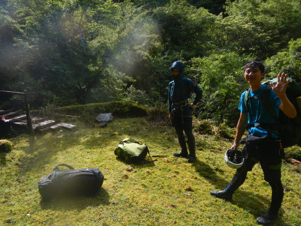 7/16 全夜発で岩倉パパ号で京都を出発、途中でみわさんを拾い、一路川上村方面へ。前鬼への道をいくと雨がザーザーふっている。。。梅雨明けを予想していたが大気の状態は不安定なようでとにかく雨がザーザーで不安を掻き立てられつつ、前鬼へ。途中鹿がたくさん。鹿のシルエットにはついつい反応してしまう。林道に入る直前には真新しい鹿の轢死体。背ロースだけでもいただこうかと一瞬考えたが雨も降っているし、いつ死んだのかも不明なのでやめておく。道の駅上北で仮眠するつもりだったが雨もふっているし、意外に街中だし、テント泊禁止だし、、、、で、現地までいってテントを張った。雨はやんでいて明日に期待しつつ軽く飲んで宴会して就寝。