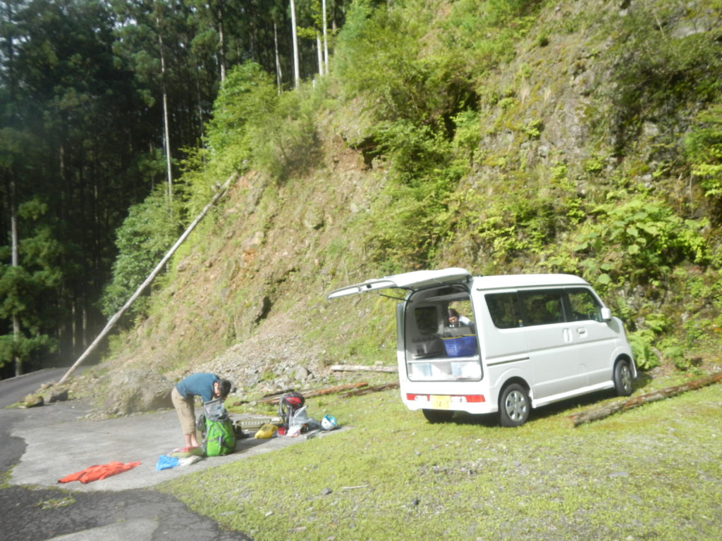 朝起きるとけっこうな大雨。水量も多そうだし、前鬼ブルーは期待できそうにないし、どうしよう。。。雨雲レーダーという便利なものを見ると雨が降っているのはどうやらピンポイントでここだけのようなのでどこかに転戦しようということで、後発メンバーに連絡をとるべく林道を下山開始。するとちょうど後発メンバーのかっぱ夫妻とすれ違い、一緒に下山。とりあえず雨雲から逃げるように北へ移動すると上多古あたりにきたらぱーっと晴れてきた。これはこのあたりの沢なら登れそう!ということで上多古本谷に転戦することに。幸いすぐそこだったので車で移動。林道終点手前の立派な駐車スペースに車を止めて準備することにした。準備していると別パーティが車2台で到着。神戸の方で日帰りで抜けるそうだ。われわれは宿泊予定。がんばってくださいねーと別れる。