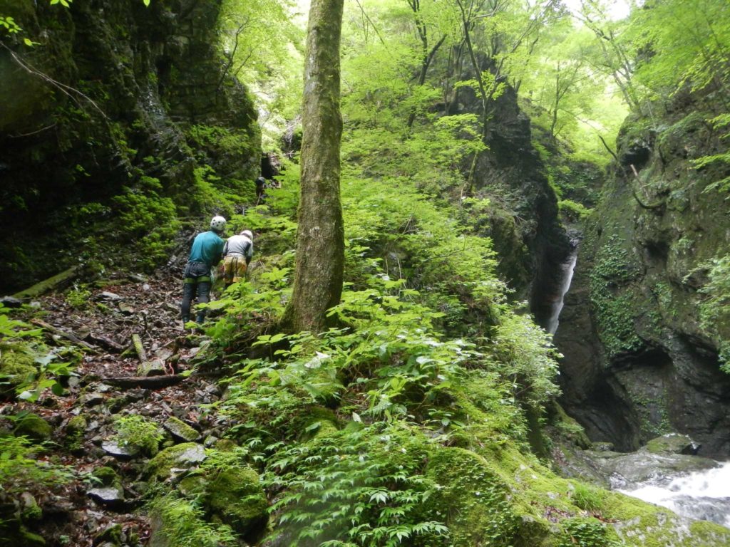 この懸垂でロープの末端を解き忘れる初歩的なミスをしてしまい、なんとかバイル片手に登り返して復帰。基本動作を徹底せねば。。。復帰後、阿古滝を目指して進む。