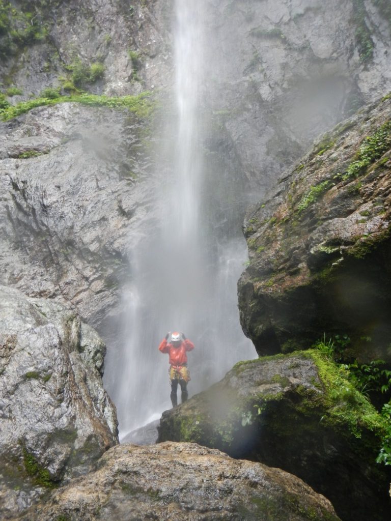 神戸パーティの後につづいて巻きを選択。すこし悪い箇所のロープ確保を終えて落ち口にもどろうとするが、どんどん上に追いやられてしまい、すこし迷う。もう少しあがれば尾根っぽいところを越えれそうだがさすがに上にあがりすぎと感じ、懸垂で戻る。先に行った先行パーティはどこにいったのだろうか?結局この先パーティにあうことはなかった。懸垂でもどったところから沢が見える絶壁まで歩き、そこから懸垂することにした。垂直の懸垂約20mで沢に降り立つ。降り立った場所は煙突の滝の落ち口。どうどうと水が流れおち、すごい迫力だ。