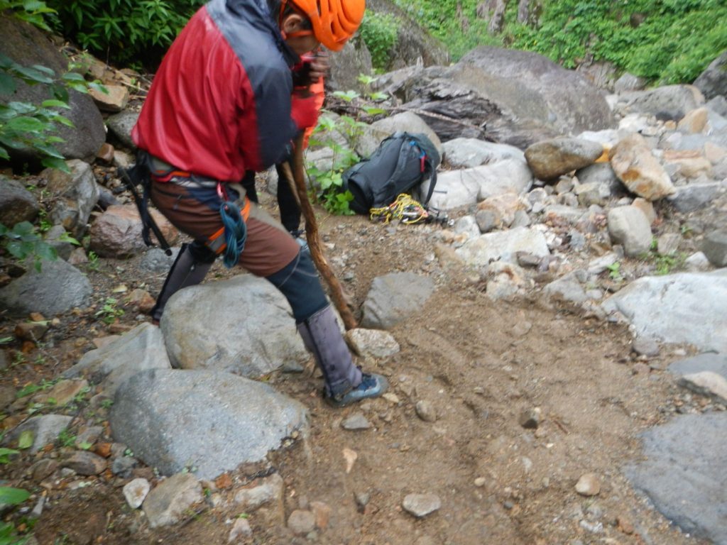 10人も登るのをこのまま待っているのも時間がかかりすぎると思われたので我々は左岸からの小さな巻きを選択。すこし脆かったがこれまで散々白山の沢の超絶悪い高巻きを経験しているのでこんなもんは高巻きの部類にすら入らない。4人が巻きを終えて団体様の前に出て進む。後ろを振り返ると団体様のうちの3名が我々の巻いて通ったあとをついてきた様子。