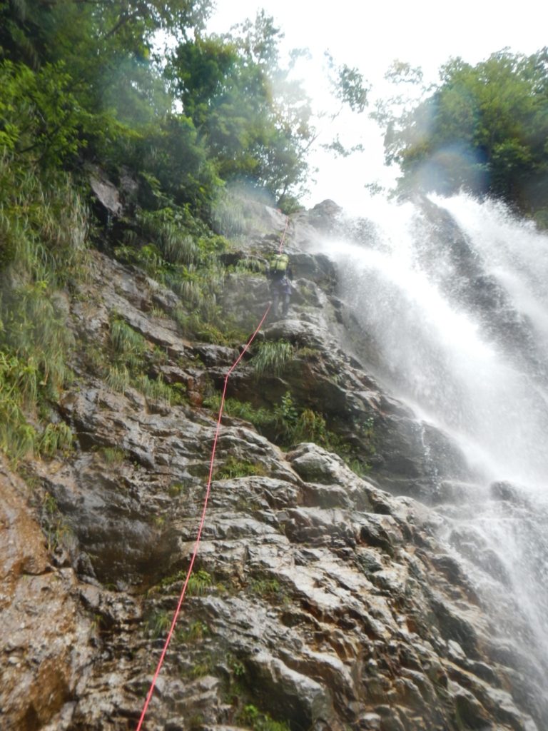 休憩しているとその3名が我々の前に出た。外見からしてすごく沢慣れしている感じだったのでさっきの人たちとは別パーティだったのかな?とか思っていたらその先の滝でロープを出してフィックスしていたので結局みんな同じパーティだったようだ。フィックスされたロープの横を登る。ロープのせいでちょっと登りにくかった。