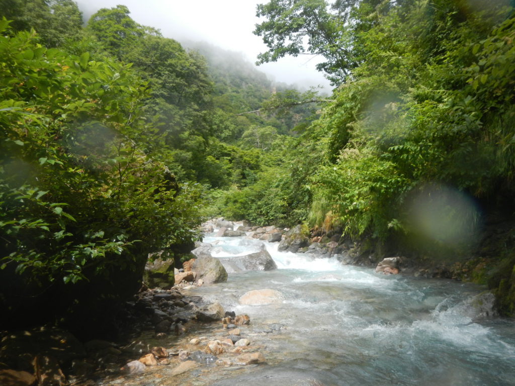 なんだかバスクリンみたいな青い水に癒されつつ、かなり増水している沢を進む。一時間ほどは退屈な歩きばかり。ときおり晴れ間ものぞいて天気が悪いと思っていたけれど儲けたなーといった感じ。