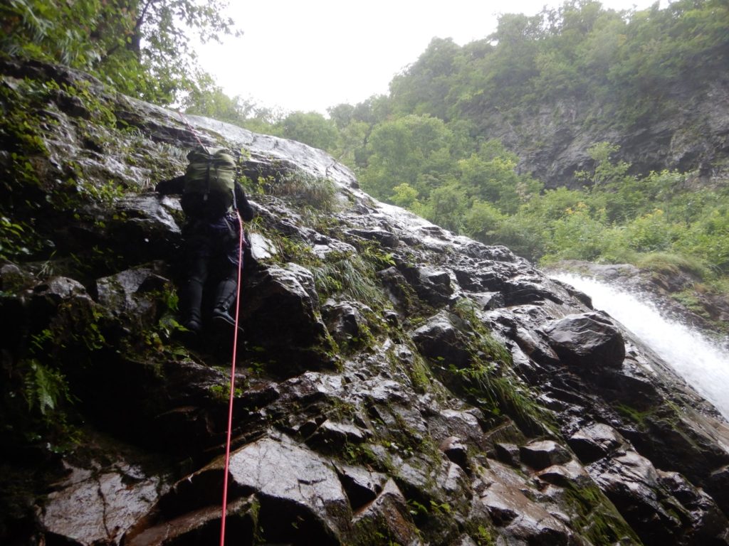 先行パーティはすでにこの滝を抜けつつあるようだったのでのんびり前衛の滝をロープ出して登る。そしてこの谷最大の滝の下に立つが、ロープがいるかいらないか微妙な感じだったが、念のためにロープを出して登った。新品のロープは気持ちいい。