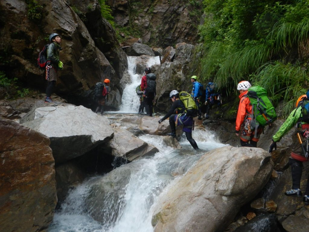 次々と現れる小滝、そしてちょい悪の滝。高さのある滝に関してはロープを出しつつ登る。この滝は右から?左から?いろいろ考えながら突破していくのは楽しい。