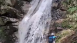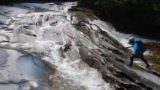 ロープをだしつつのんびり登っていたので前のパーティに追いつくことはないだろうなーと思っていたが、何故か前のパーティーが見えてきた。10人くらいの大所帯で、なにやら皆が手持ち無沙汰な感じだったので様子を聞くと、どうもフン詰まっている様子。トップの人がバシャーンバシャーンと水に落ちながら滝を登ろうと何度かトライしている様子。ここは以前にショルダーしてカムを決めて登ったと言われる滝かな?