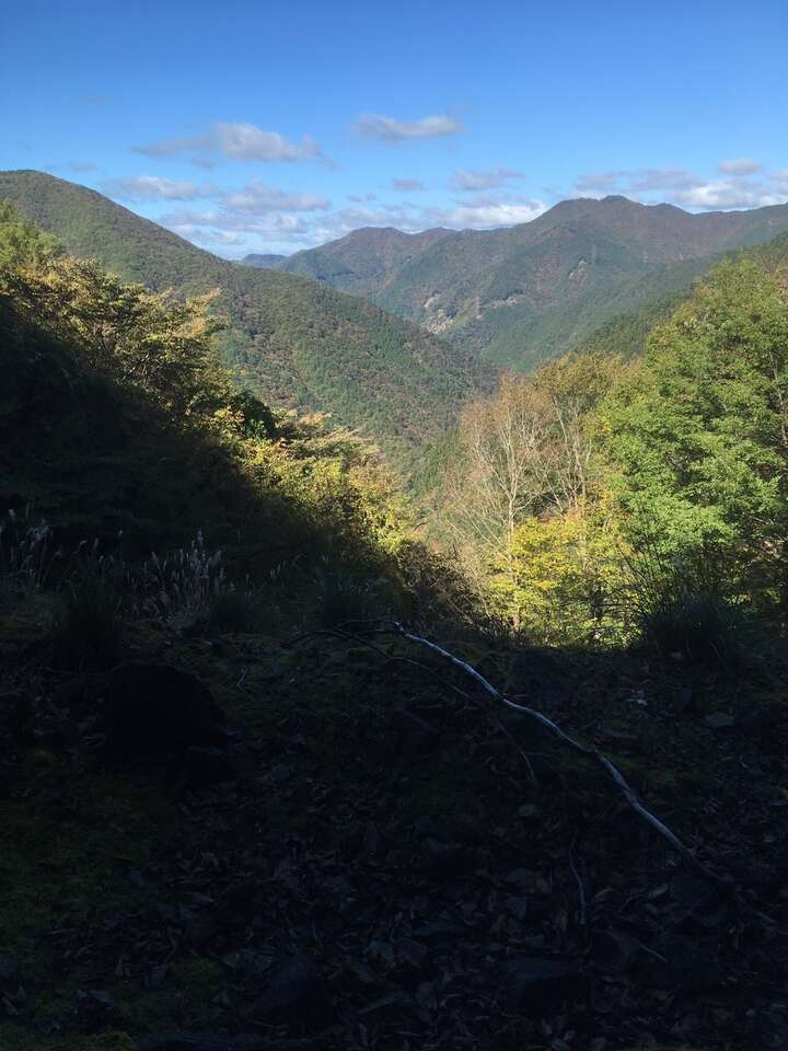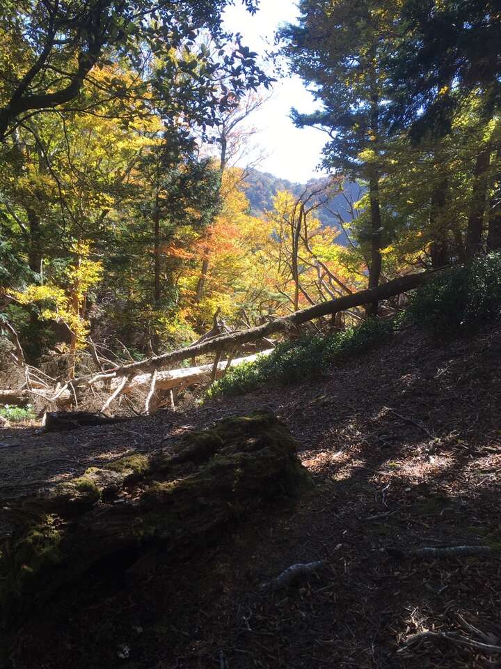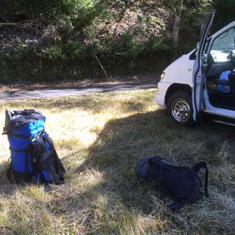前日夜22:00に大阪某所に集合、奈良に向けて出発する。途中の道の駅にテントをはって仮眠。早朝にテントを張っていることを掃除のおじさんに注意されてあわてて撤収し、そっから林道終点までドライブ駐車場には9:00頃到着し、林道終点からさあ出発。初日は楊枝小屋までの予定なので少しは気持ちが楽。いきなりの渡渉を強いられ、靴はびしょぬれ・・・しかし天気はよくて気持ちよい。廃林道をどんどん歩く。ところどころ大きく道は崩れており、少し怖い思いをしながら行くが、まあそれほどのことでもない