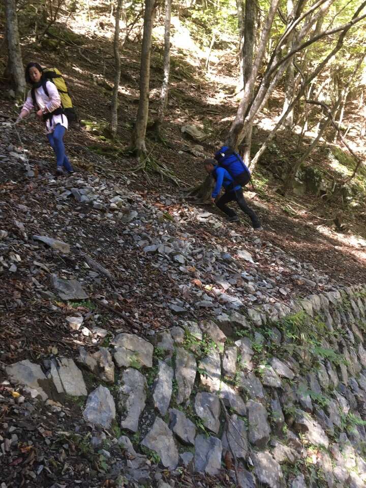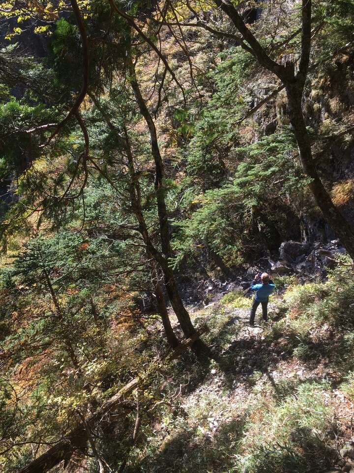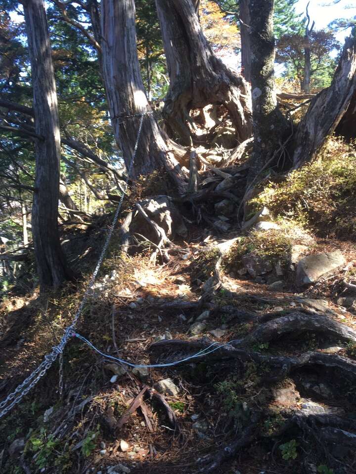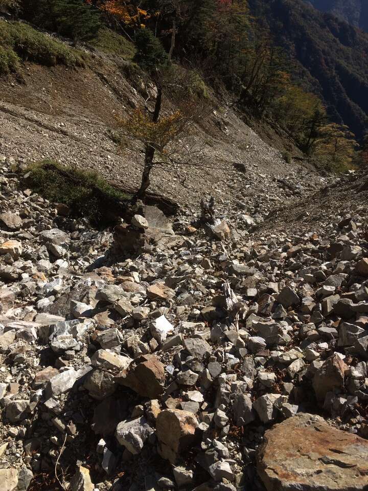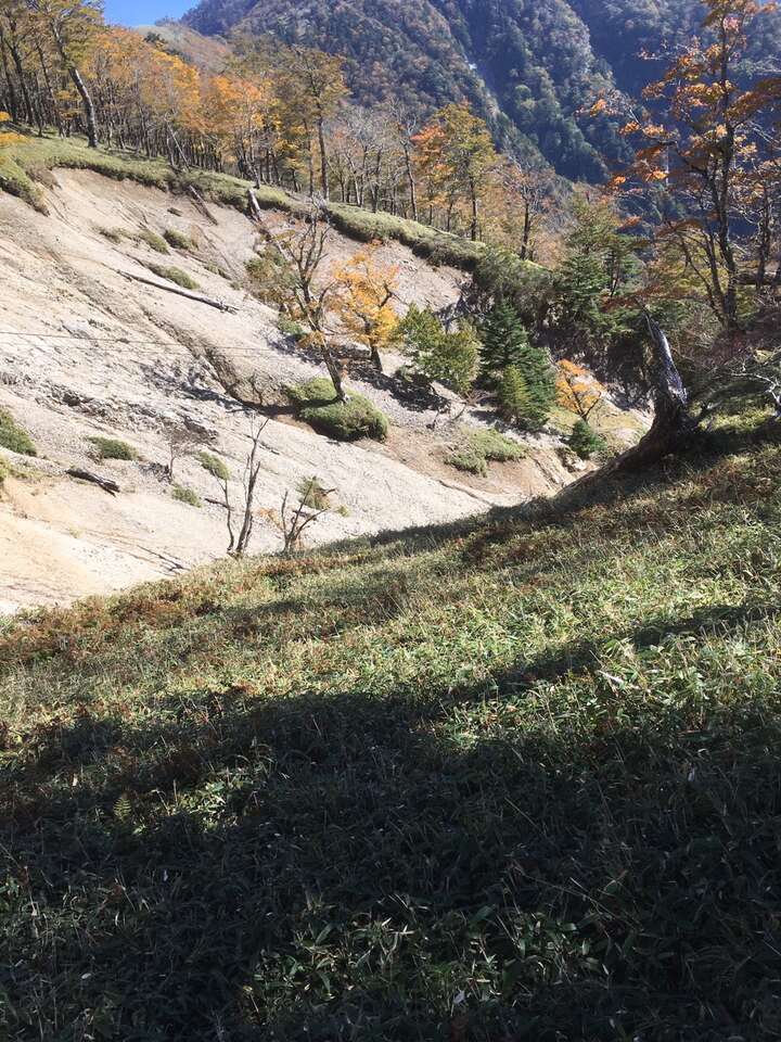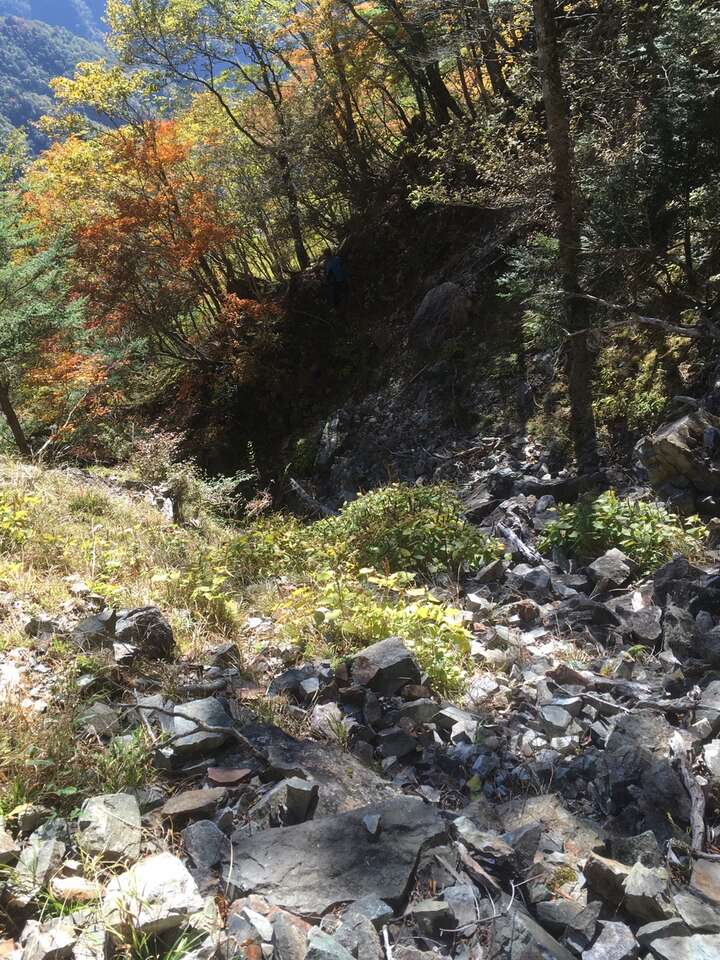 結構あぶいない道であるが下れないことはない、落石に注意しつつ随所にテープはあるので右に見える七面山南壁に沿うような感じで降りれるところを降りていくイメージ。