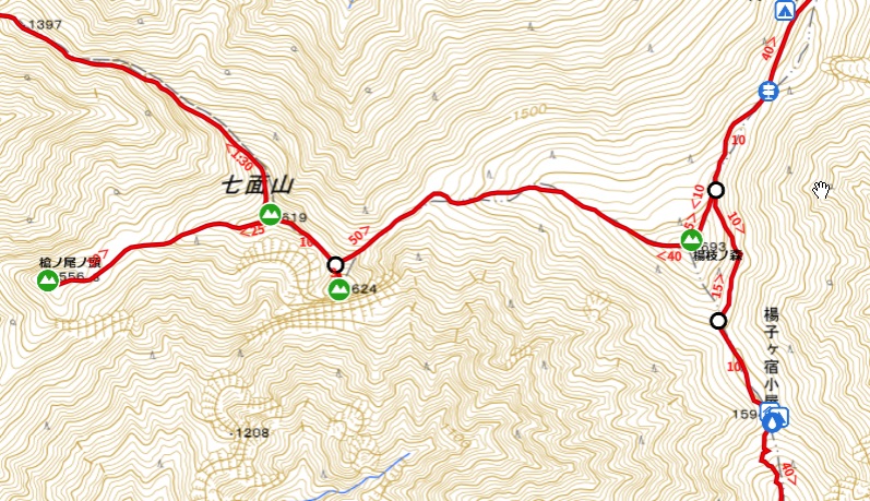 駐車場(9:33)-七面山東峰(12:24)-楊枝の森(14:42)-楊枝ケ宿小屋(15:12)