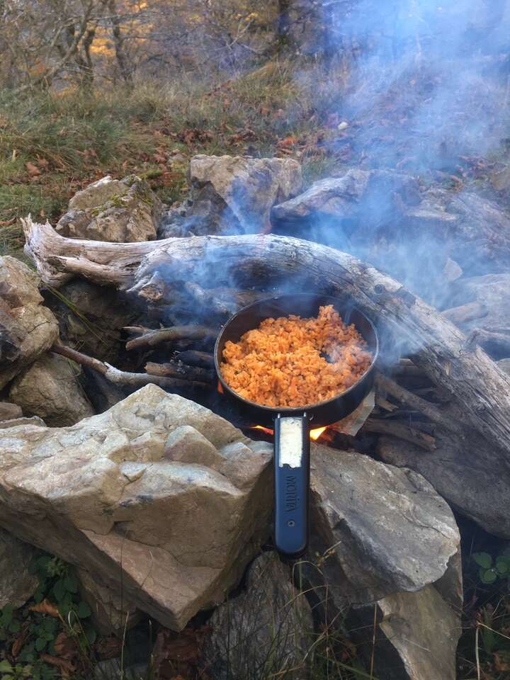 小屋は快適で小屋の前では焚き火のあとがあり、焚き火も可能。道すがらマキを集めておいたので早速焚き火をして冷凍チャーハンをあっためて食べた。軽く宴会して明日も早いので夕方には就寝。明日はいよいよ登攀。どうなるだろうか・・・緊張してあまり眠れず、長い夜を過ごした。
