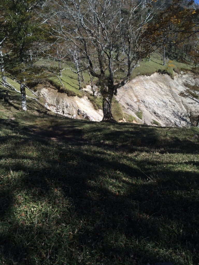 さて、明日の下降路の偵察を行う。下降路は写真の場所からざれたルンゼをくだる。ルンゼをくだっていくと勇者の剣といわれている木のケルンみたいなものが勇者の剣みたいにささっているが、この目印はいつまであるのかはわからない。それ以上はあぶなくて下れないな?なところまでいくとその勇者の剣はあり、そこから右に入っていく