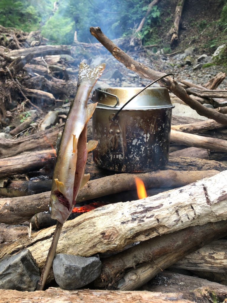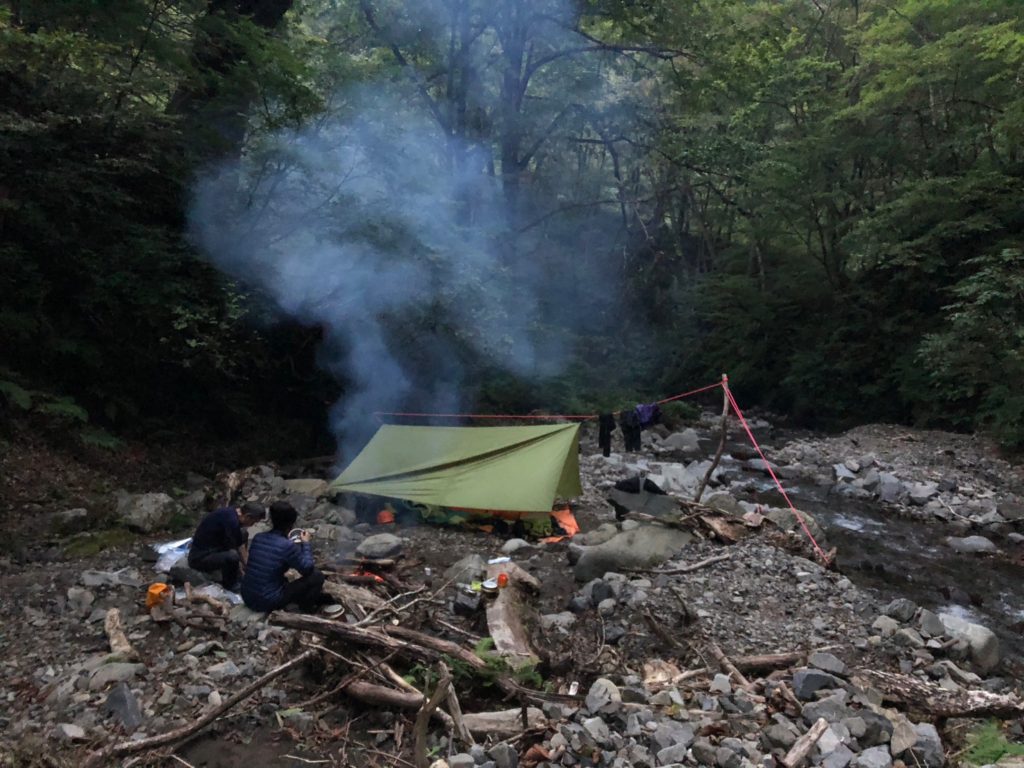 もう少し釣り上がれば釣れたかもしれんけど時間もないので早速釣れた魚を捌いたり薪を集めたりタープを張ったりでなかなか忙しい。