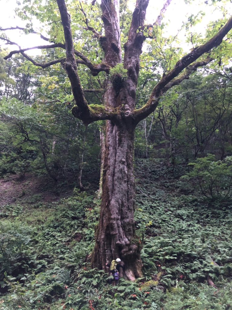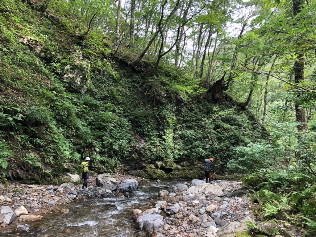 あとは適当に下るとだんだんと水が増えてきて開けた雰囲気になってくる。まわりをみると見事かブナの原生林で巨木があちこちにある。国有林なんで植林は皆無で荒れてしまった山も昔はみんなこの美しい森と同じだったのだなあとしみじみ思う。