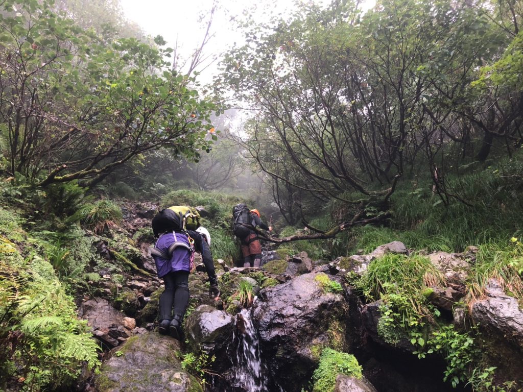 おおむね問題なく沢を下って駐車場に到着。本来であればここで終了であるが、林道が通行止めのため、あと2時間のおまけ歩き。今回の沢を振り返りながら、台風の雨の中を「どうせぬれても一緒・・」な感じで下山した。