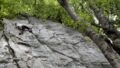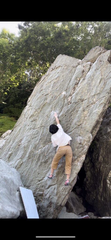 スタートカチ課題、初手取りは足を信じて思い切ってクロスムーブ、2手目はバランスを整えて、ピンポイントのちっさな足まで持ってって、またクロスムーブまでが核心。最後のカバ取りが、行ってみたら私にはパツパツで遠く、なんとかレストで粘って完登。