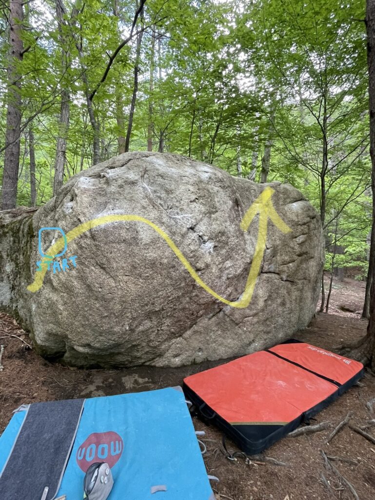 核心は中間部の気持ちの悪い持ち感の左手デッドで耐え、そのあとの右手でロックを効かせて下へ入り込むこと。核心部までは手順足順を上手く組み立てて、なるべく省エネで。リーチのある方は、全く違うムーブで完登チャンスも。