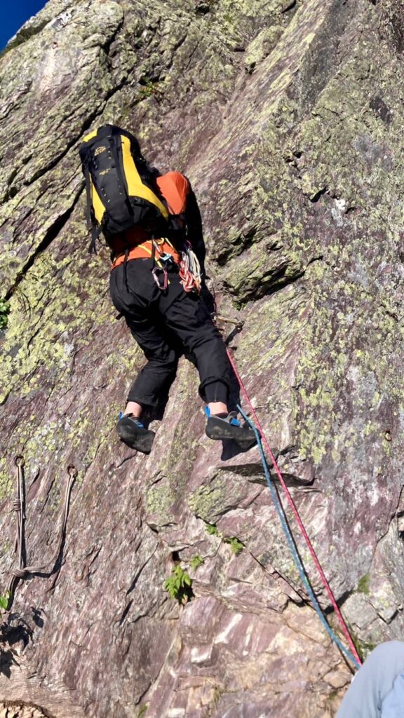 準備して早速登攀開始。何より人気のルートに一番に取り付ける優越感。宿泊装備が入ったザックにアップ無しで登る