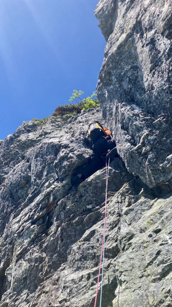 5p Ⅲ カンテ上のクラック/Ⅲ+ カンテ~6p Ⅲ ナイフリッジトラバースからは、最終ピッチ目前でルートの性格が変わり、これまでのマルチピッチルートを締めくくるにちょうど良いアクセントでした。楽しさの絶頂を迎えたころに7p Ⅳ 城塞ハング。