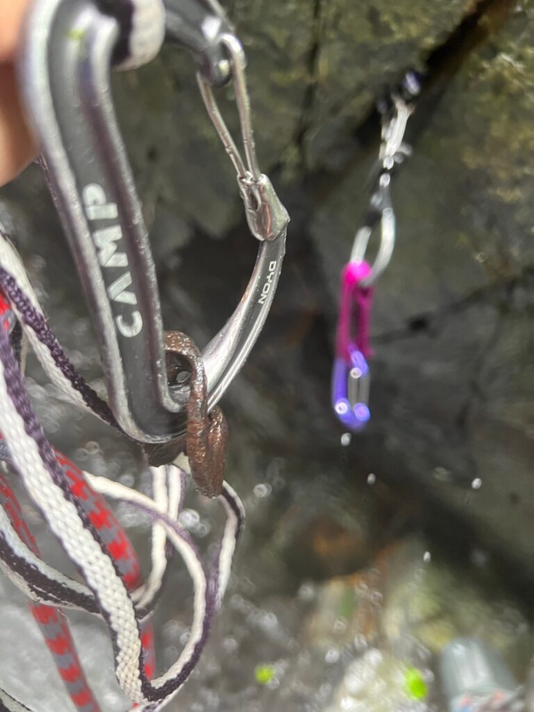 残置ハーケンがちょこちょこあったのですが全て腐っていたので簡単に取れる(折れる)物はいくつか回収したのですがあっても使わない方が良いと思われます。