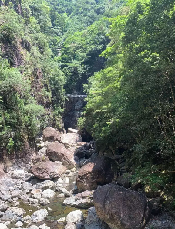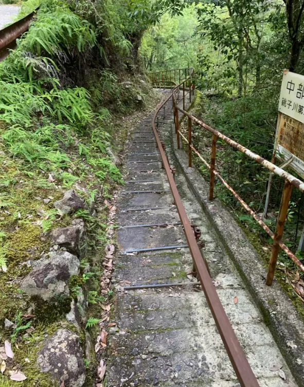 それにしても水はぬるくて天気が良すぎて暑い。。。猛暑や・・・前方にようやく巡視路がみえてきた。結構がんばっているけどまだ地図上では全然進んでいない。巡視路に這い上がって吊り橋を渡ると前方にさらに吊り橋が見える。あれが三平滝への巡視路だろう。