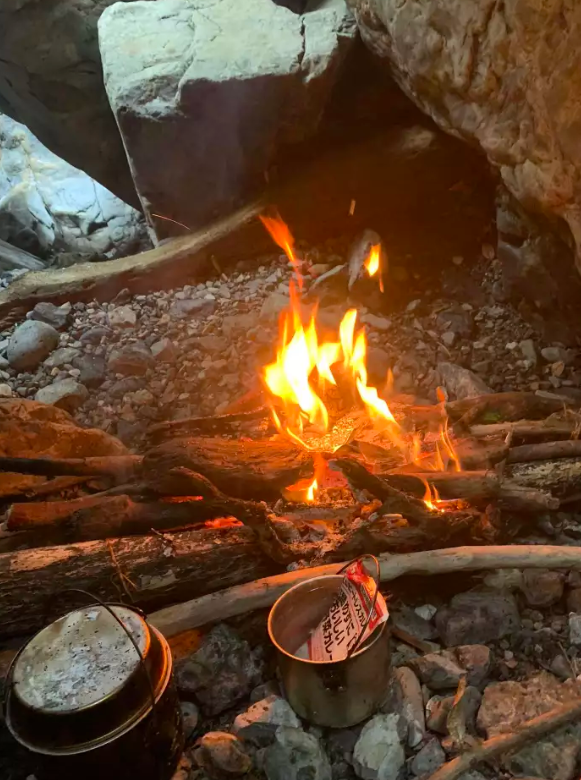 この時点で時間は15時半から16時くらいだったように思う。で、荷物もやたら重くて・・・もう疲れてこれ以上歩くのはいやになってしまい、おりしも懸垂下降地点がよさげな岩小屋風の河原だったで早速キャンプと焚火の準備。まあノンビりやりましょう。というか、この背中の重い荷物を消費しなければもう無理だ。。。笑