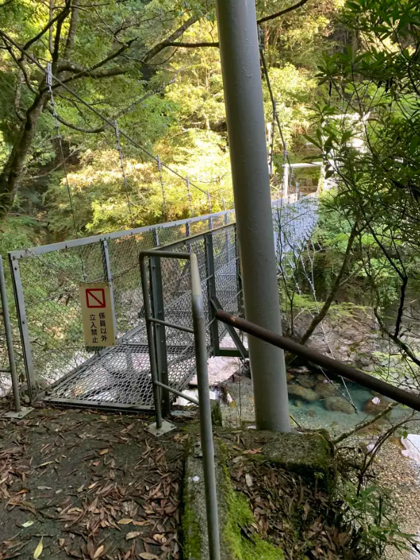 階段を降りると釣り橋が出てくる。この吊り橋は渡らずに右の脇道をおりていく。