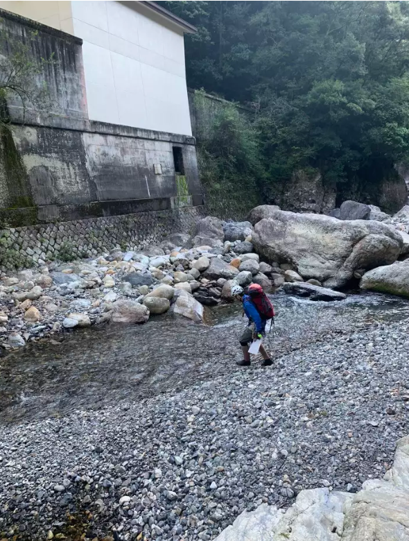 さて、準備をして出発。天気も予報では不安はなくて気持ちよい。水もぬるくて暑いので高巻きなどでバテそうな雰囲気。発電所へと階段を降りていく。