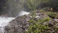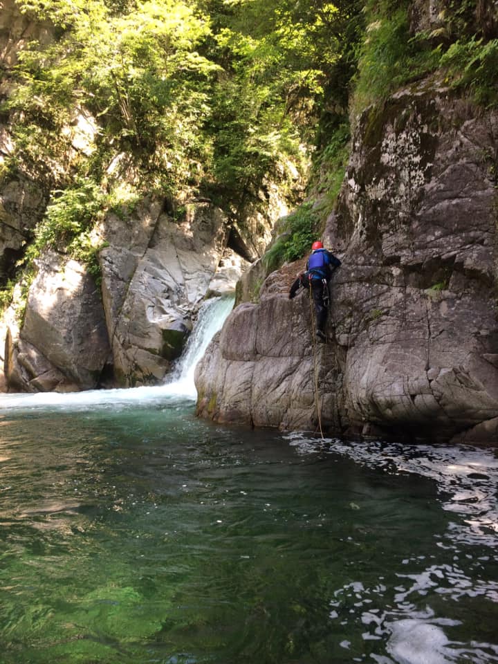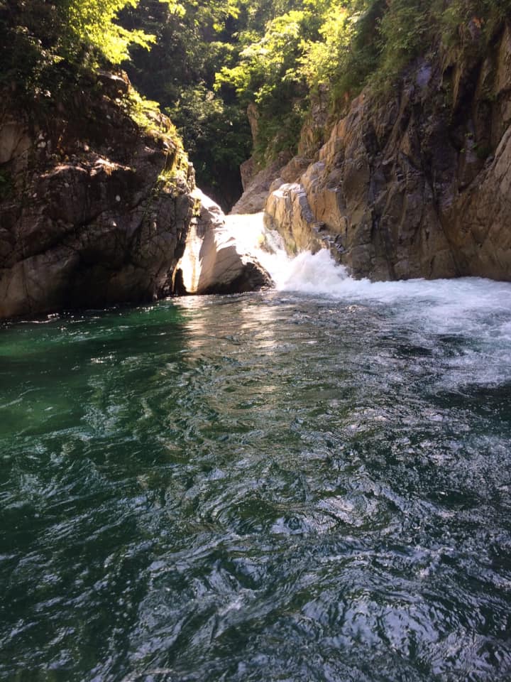 ロープをつけてYNS君が流れていく。もし取り付けなければ私がロープを引く算段だ。すごい速さ。。。おっ!幸いうまく取り付けたようだ。(うまく取りつかなければ釜に巻き込まれて・・・)続いて私が流れる。すごい流れ。流れるプール!?の比ではない。激流のようでなすすべもなく釜に吸い込まれていく。迫りくる岩壁。タイミングを見計らって「おりゃ!」という感じで岩にへばりつき、うまい具合にある斜めのスタンスに立ちこむ。やれやれ。