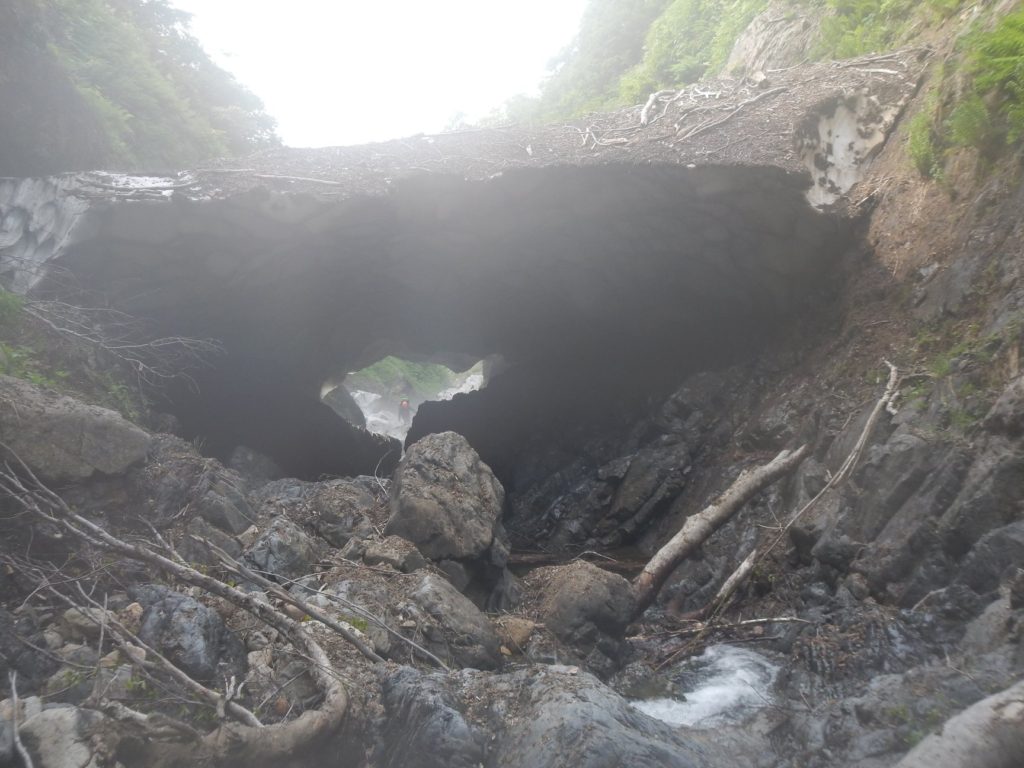 しばらく進むと雪渓が現れて、白い靄が立ち込めていて不気味な雰囲気。YNS君は足がはやく、普通に歩いていると引き離されていくがなんとかこの雪渓だけは全力を出してついていき、急いでくぐって通過・・・・やれやれ。