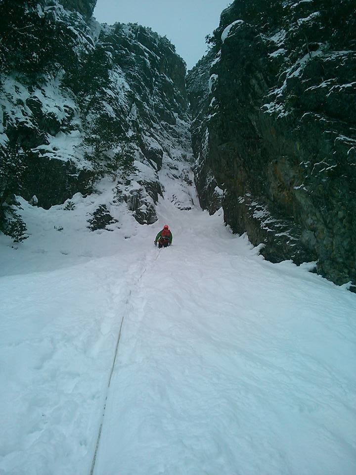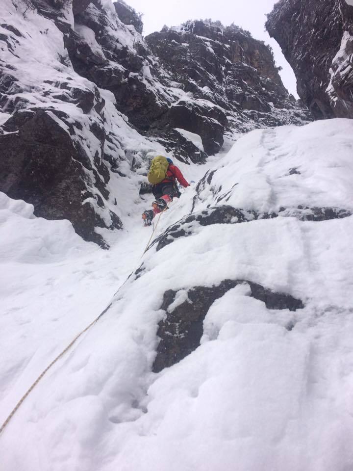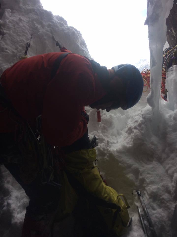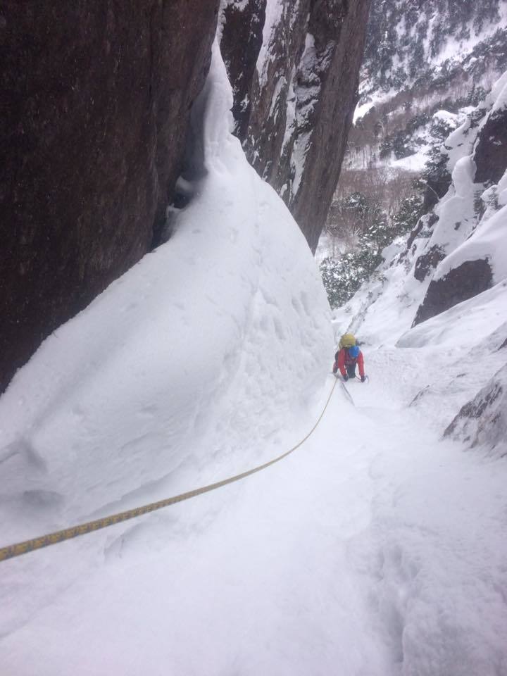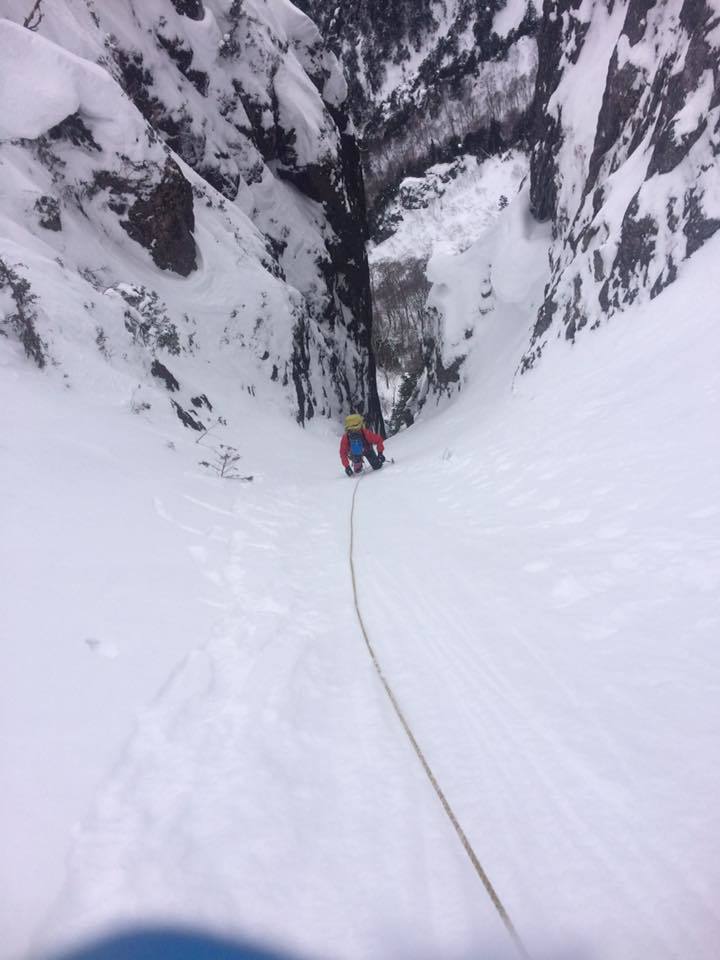 そんなこんなで時間をくったものの、昨年に比べて雪も多く、1ピッチ目なんかは雪にうまって簡単。そして昨年はいけなかった右側から氷が発達しているので簡単にいくことができた。2ピッチ目も昨年は左から難しげな壁をなんとかアイゼンガリガリで登ったが今年は右に氷が発達していてそこからのっこす。胎内くぐりパートも雪がつまっていて快適。しかしここで落氷でとくさまはサングラスを叩き割られてしまった。私のサングラスを渡して進む。たまにしか持ってこないサングラスであるが役にたってよかった。チリナダレが結構頻繁にくるのでサングラスはあったほうがいいと感じた。