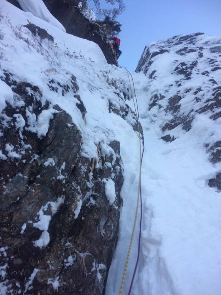 もし先行がいない場合は3ルンゼ終了の立ち木でビレイし、グラスホッパー左のバーチカルの最初の部分をこなし、すこしだけ傾斜がゆるんだ滝の途中でピッチをきればちょうどウマクいくだろうと思う。今後の参考に・・