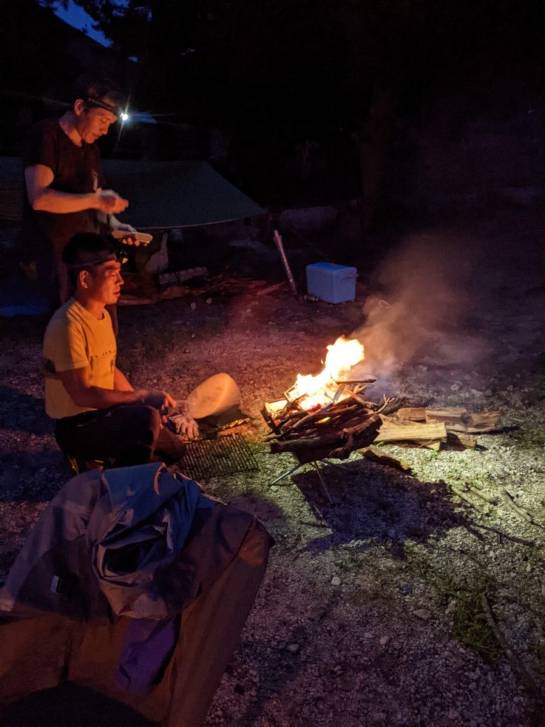 下山後、軽くコンビニで酒を補給し、いきつけのキャンプ場に移動して焚き火キャンプ。沢用のタープを張って沢泊未経験の方にどんな感じで沢泊するのかの経験をしてもらった。必要装備等が把握できたでしょうか?