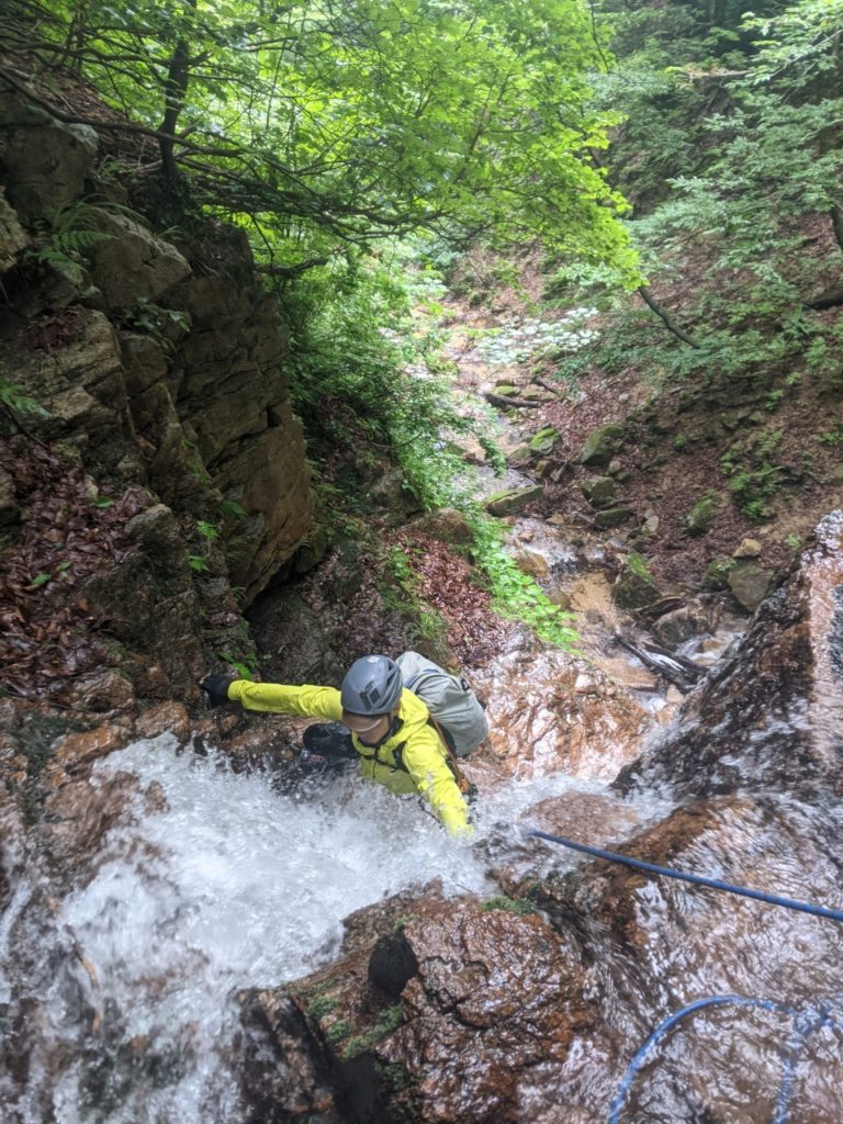 沢がまだ3回目というYさんと今年、会に復帰した同姓のYMさん。沢はまだ4回目くらい。しかしYさんは強靭な体幹を持っていてすたすたと通常の3倍くらいの速さで登ってくる!岳人クラブの黄色い稲妻・サンダーボルトと勝手に命名。
