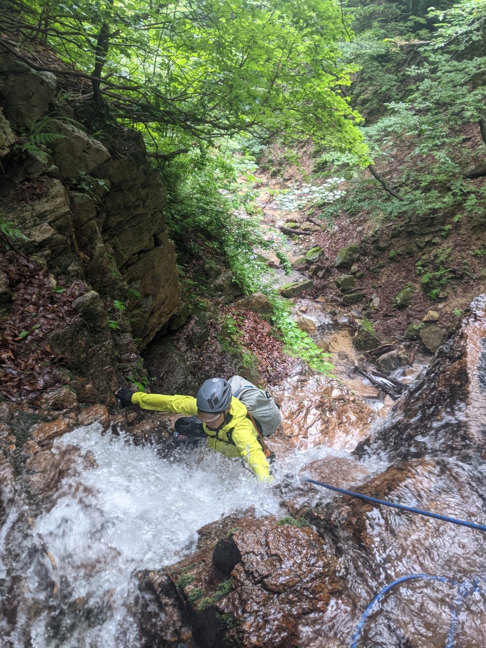 うつろ谷は出てくるほとんどの滝を直登で越えていける。遠目に迫力がある滝ばかりだが近づくと容易に登れて慣れた人ならロープは不要、、、か、ちょっとワンポイントお助けくらいで超えていけるので快適。今日は水量多めだったので念のためにロープで確保するシーンも多かったです。