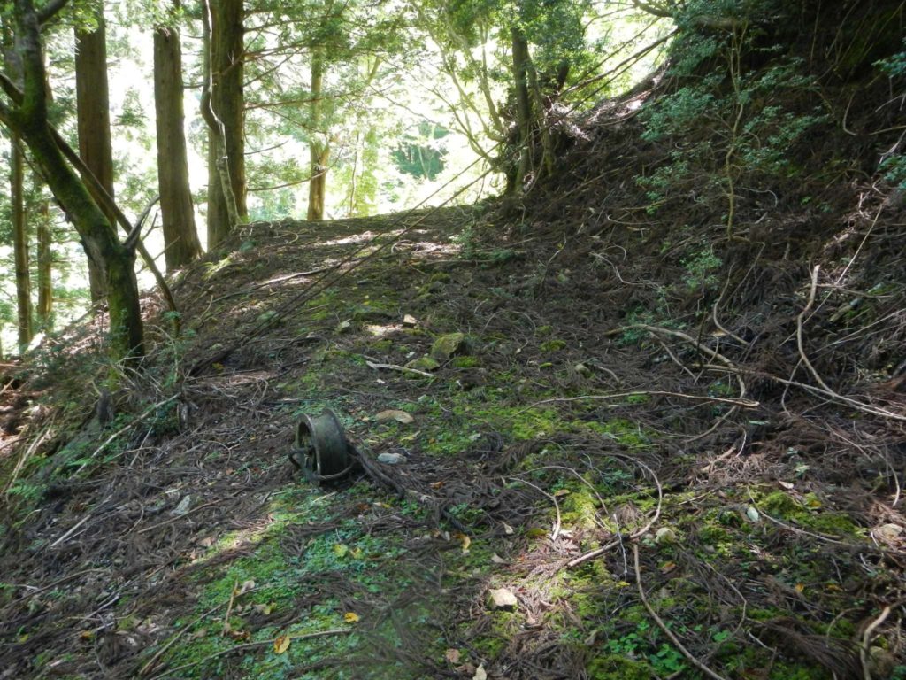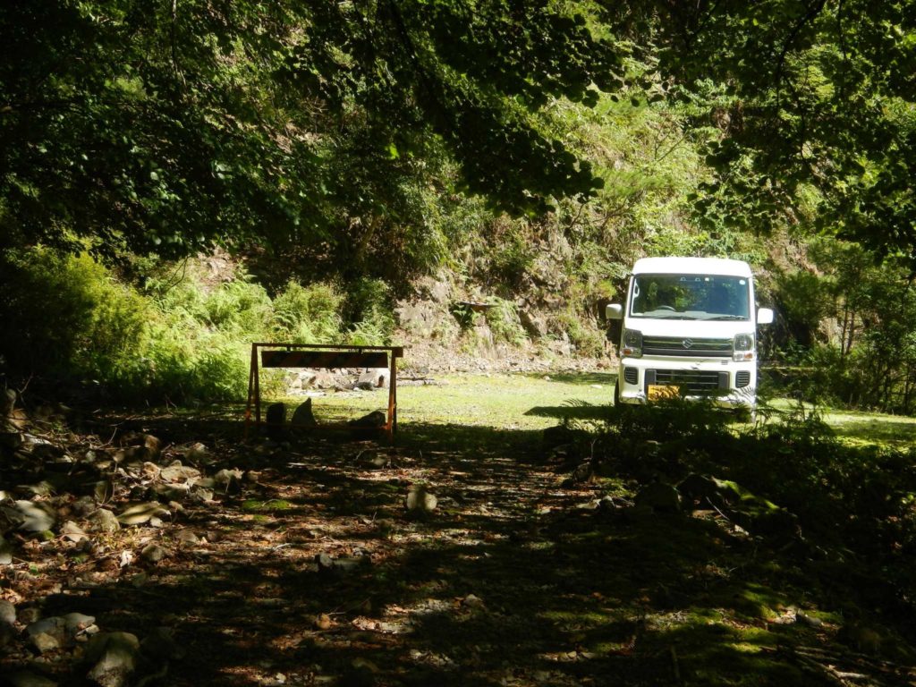 林道はゆるやかな下りで途中には快適そうなテント場みたいな土地も。焚火跡があったので誰か泊まっているようです。薪も豊富。