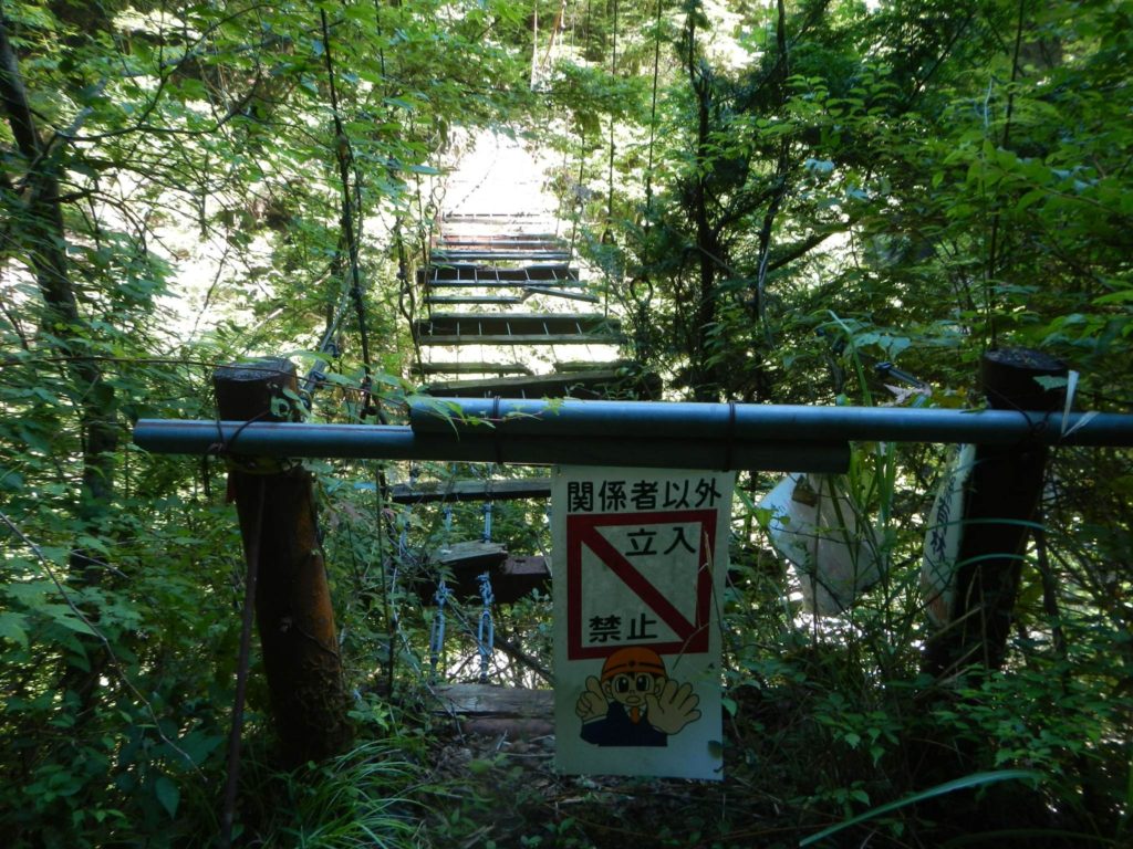吊り橋のかかる中の川出合。立派な滝をかけている。吊り橋はいかにもやばそう。