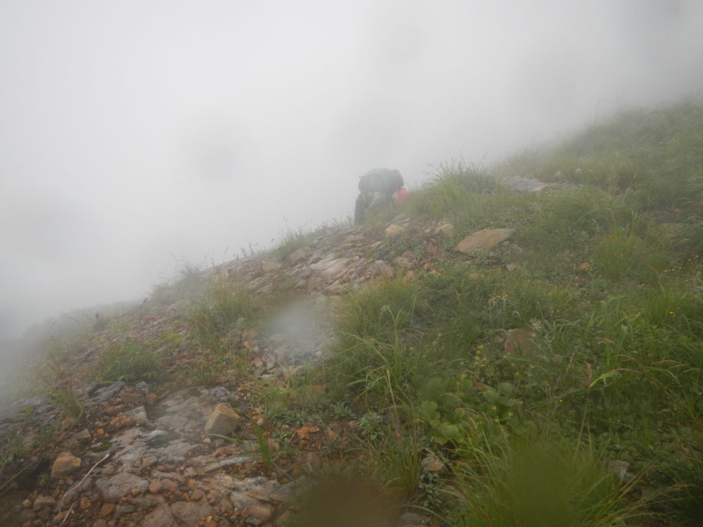 快適な岩登りを意外に短めなイメージ終了し、草付きに変化してきた。草付きになるととたんに歩きにくくなる。無意識に岩を目指してしまい、頂上直下の岩に取り付く。傾斜があって岩も脆く、これは越えられないと判断して右にトラバース気味に移動すると岩が脆くて少し怖い思いをした。トラバース途中、頭大の石を落としてしまったがいつまでもいつまでもガラーンゴローンドーンという音が響いていた。。。おっかねえ。。ここを超えたら正真正銘核心は終わり。最後の集中だと思って脆い岩をマントル返して乗り越えてハイマツ帯に突っ込んで一安心!どうやら生きて帰れそう。