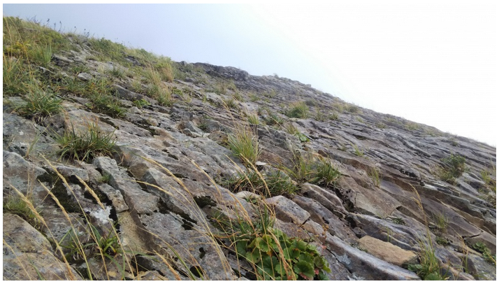 そのうちに大平壁に到達したと思われ、草付きを登るよりも岩を登ったほうが安定するような傾斜になってきた。岩を選んでいって登るようなイメージでどんどん高度をあげていく。ところどころもろい岩や巨大な浮石もあるので注意して進む。